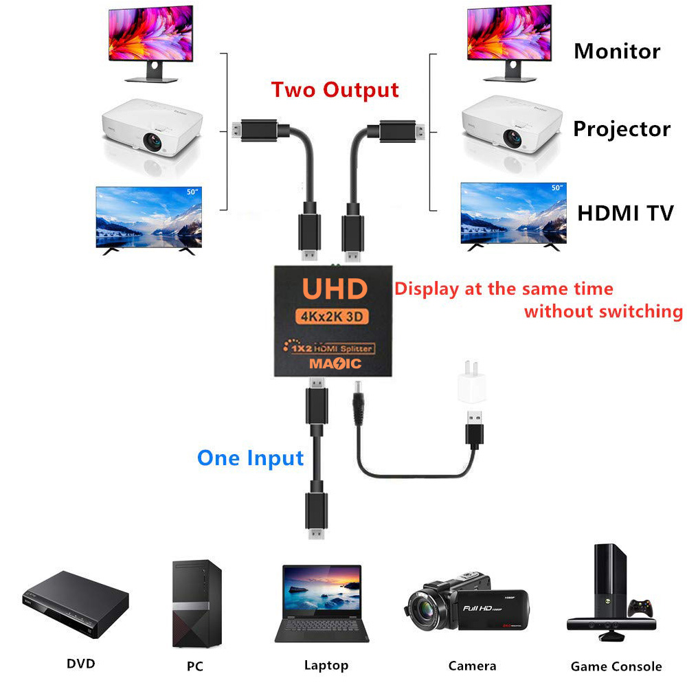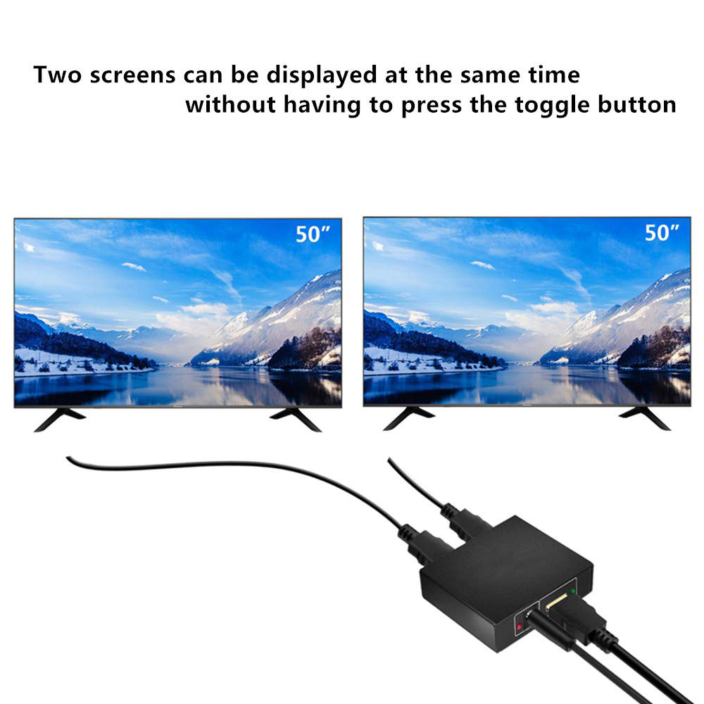 The 1 to 2 output HDMI compatible splitter distributes 1 HDMI compatible source to 2 HDMI compatible displays simultaneously. Compatible with HD-DVD, SKY-STB, PS3, Xbox 360, etc. It offers HD video for supermarket, shopping mall, HDTV, STB, DVD, HDCP compliant.