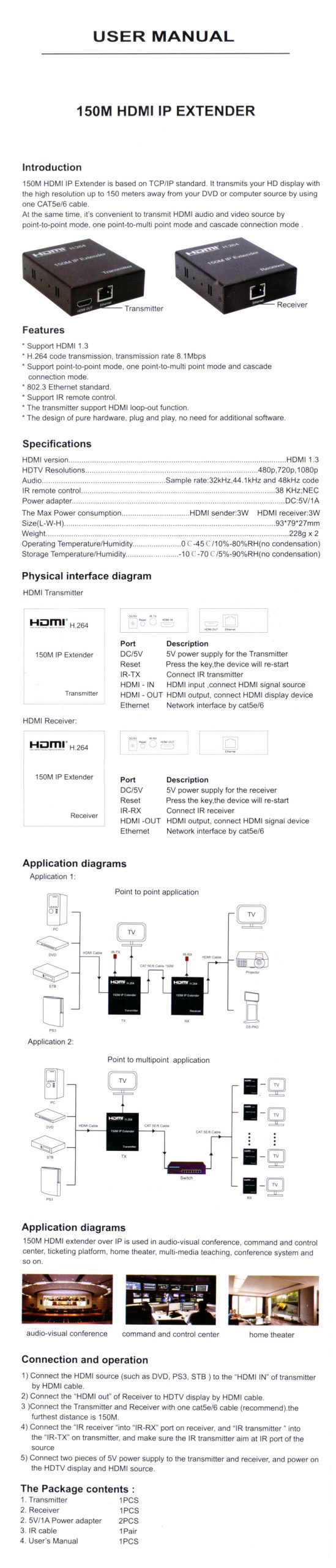 150M HDMI IP Extender is based on TCP/IP standard. It transmits your HD display with the high resolution up to 150 meters away from your DVD or computer source by usingone CAT5e/6 cable. At the same time, it’s convenient to transmit HDMI audio and video source bypoint-to-point mode, one point-to-multi point mode and cascade connection mode .