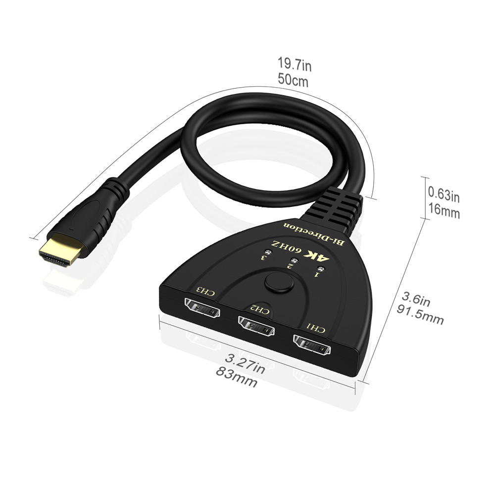 New HDMI Switch 3 Port 4K HDMI Switch 3×1 Switch Splitter with Pigtail Cable Supports Full HD 4K 60hz with Power Supply Cable